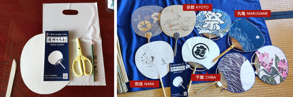 Pengajar dalam lokakarya ini adalah Ohta Mitsue, yang merupakan generasi keempat dari pembuat kipas uchiwa yaitu keluarga Ohtaya. Dia juga seorang pengrajin seni tradisional bersertifikat. Di atas meja tersedia pola cetak, gunting, pensil, spatula, kantong plastik, serta brosur tentang Boshu uchiwa. Kami juga diperlihatkan berbagai jenis uchiwa, termasuk Edo uchiwa (Boshu uchiwa) yang akan dibuat dalam lokakarya kali ini, serta uchiwa dari Kyoto, Nara, dan Marugame. Lokakarya sesi siang dimulai pukul 13.30. Dari 21 tahapan dalam proses pembuatan kipas uchiwa, kami akan mencoba tiga tahap, yaitu: ⑯ menempel (kertas belakang), ⑰ memotong, dan ⑱ memasang tepian. Di tengah ruangan, sang pengajar memperagakan proses pembuatannya secara langsung.