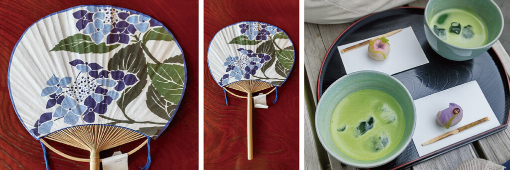 Setelah menyelesaikan pembuatan kipas, saya menikmati teh matcha dingin dan kudapan “jou- namagashi (kue tradisional Jepang yang elegan)” di “Fukiage Chaya (rumah teh Fukiage)”. Angin yang berhembus terasa sangat menyegarkan karena lokasinya berada di tepi kolam. Kue “jou-namagashi” pada foto bagian atas berbentuk bunga “asagao (morning glory)”, sedangkan yang di foto bagian bawah berbentuk “Hotaru” atau kunang-kunang. Keduanya berisi “koshian (pasta kacang merah halus)” di dalamnya. “Jou-namagashi” yang manisnya lembut dan elegan ini benar-benar lezat. Terima kasih atas hidangannya!